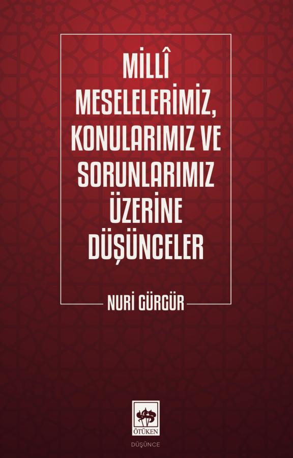 Nuri Gürgür’ün Millî Meselelerimiz, Konularımız, Sorunlarımız Üzerine Düşünceler isimli bu çalışması, Türkiye Cumhuriyeti’nin kuruluşu öncesinde çetin şartlarda verdiğimiz Millî Mücadele’ye ve kuruluşu sonrasındaki mühim meseleler ile “kırılma noktası” olarak da ifade edebileceğimiz hadiselere değinmektedir. 12 Eylül Askerî Darbesi, yargının işleyişi ve başkanlık sistemi sorunları, Türk Dünyası’yla ilişkiler, PKK ve terör sorunu, iç ve dış politika, nüfus ve sığınmacılar meselesi, eğitim, ekonomi gibi başlıklar altında ele alınan mevzularla ilgili muhasebe yapma imkânı veren çalışma, hızla değişen gündemden ziyade ülkemiz açısından hayati ve köklü konuları ele almaktadır. Bahse konu meseleler; dünü anlamak, bugünü idrak etmek ve millî şuurla geleceği inşa etmek bakımından üzerinde titizlikle durulmayı, tekrar tekrar ele alınmayı gerektirmektedir.